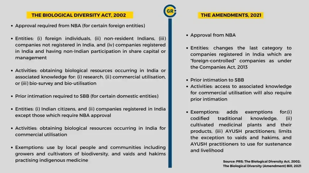 The Biological Diversity (Amendment) Bill, 2021 has faced criticism for prioritizing intellectual property and trade over conservation. Some experts have expressed concern that exemptions granted to AYUSH professionals from reporting to state biodiversity boards could lead to “biopiracy”, which involves the exploitation of naturally occurring genetic or biochemical material in commerce.