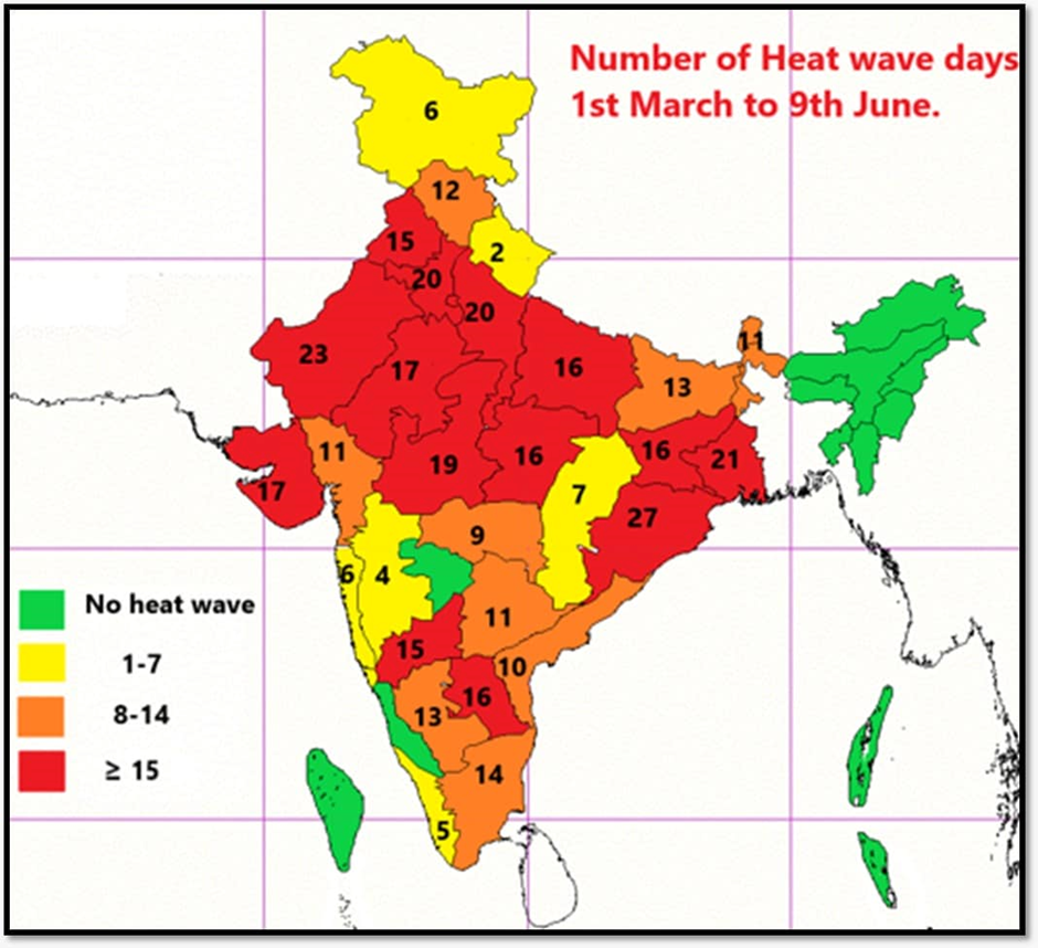 India is experiencing an intense and unrelenting heatwave. An analysis shows that between April 1 and May 31, 2024, at least once, 70% of districts recorded temperatures exceeding 40°C. The India Meteorological Department (IMD) reported that the extreme heat continued into June, with 14 of the 36 subdivisions recording over 15 heatwave days from March 1 to June 9.