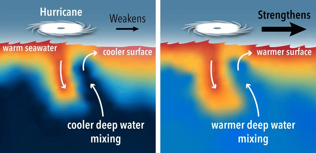 During its formation, a hurricane collects water from the sea, which is transported and later falls as rain. The hotter it is, the more water evaporates, causing torrential rains and more severe flooding.