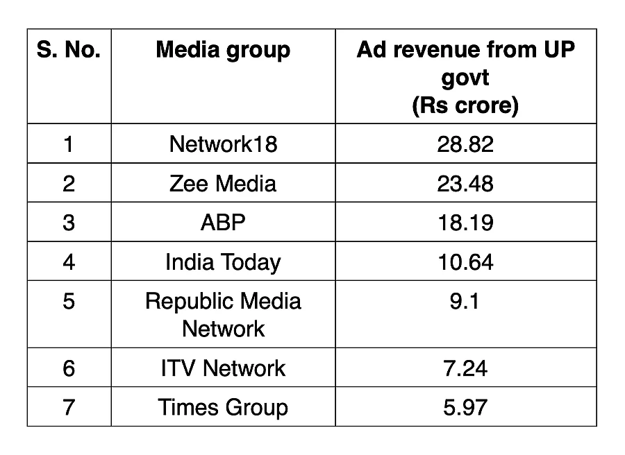 Newslaundry reported that the top five Hindi news channels receiving advertising revenue from the Uttar Pradesh government are News18 India, Aaj Tak, India TV, Zee News and Republic Bharat.