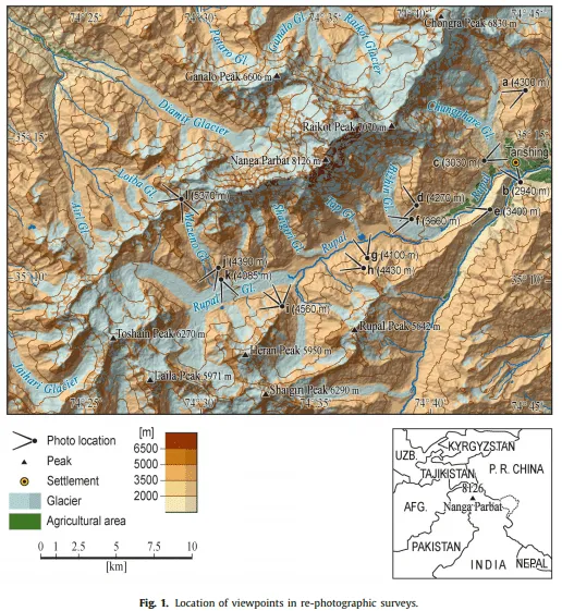 The glaciers of Nanga Parbat are one of the highest mountains in the world. Which has been slowly, gradually shrinking since the 1930s. This loss in the surface area has been traced through a long-term study by researchers at the South Asia Institute at Heidelberg University. Geographers combine historical photographs, surveys, and topographic maps with current data to show changes in glacial mass in the northwestern Himalayas after the mid-1800s.