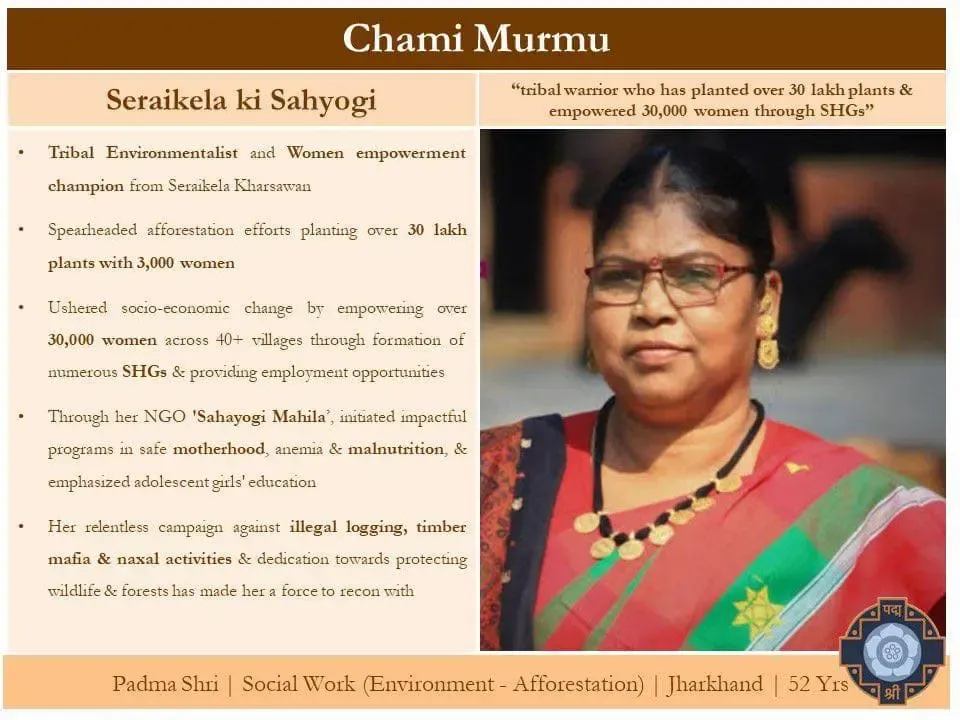 Chami Murmu, a 52-year-old environmental activist from Saraikela Kharsawan district in Jharkhand, inspired hundreds of women in her region to plant trees in over 500 villages, despite opposition from male villagers.