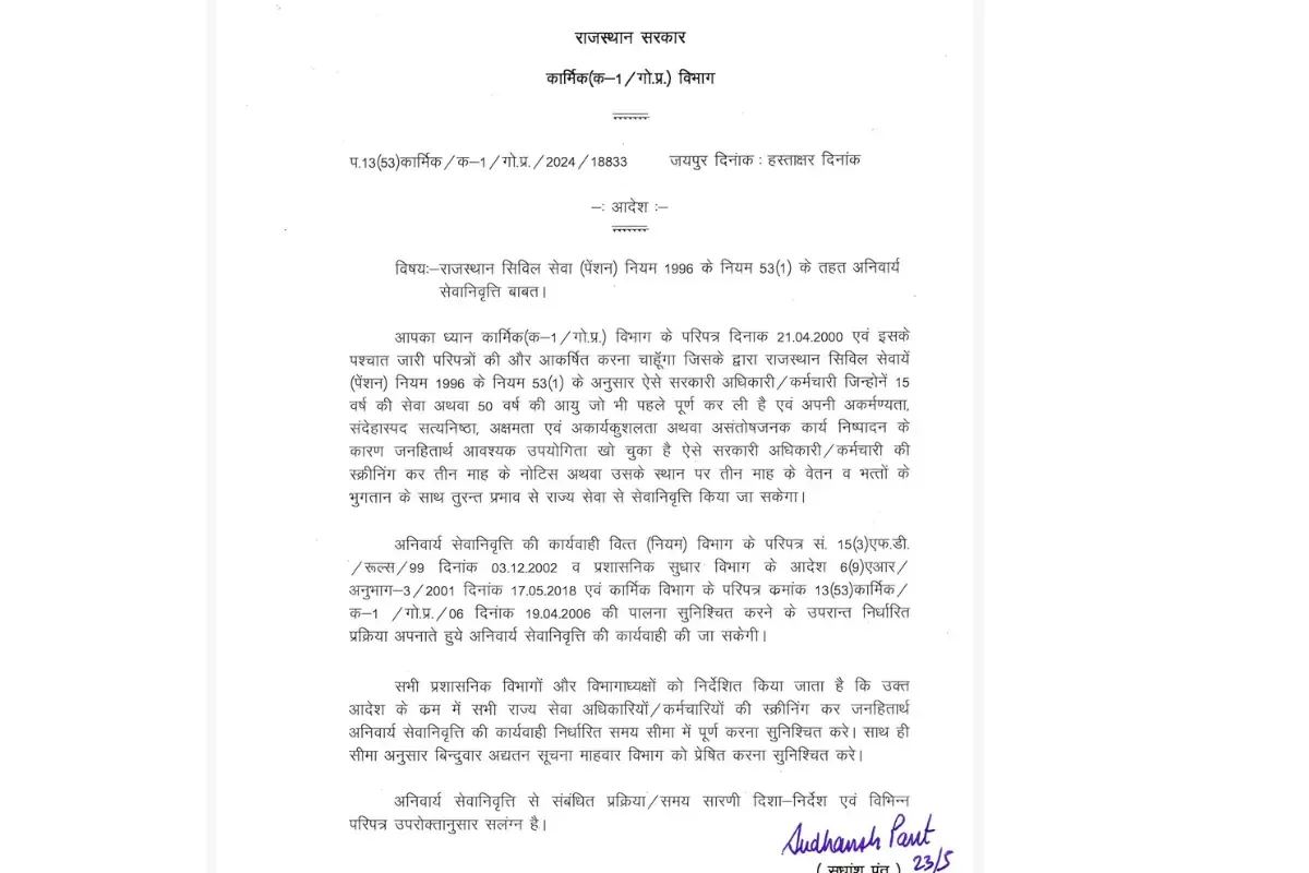 मुख्य सचिव का आदेश ऐसे सरकारी अधिकारी/कर्मचारी के लिए है, जिन्होंने राजस्थान सिविल सेवक (पेंशन) नियम, 1996 के नियम 53(1) के तहत 15 वर्ष की सेवा या 50 वर्ष की आयु (जो भी पहले हो) पूरी कर ली है। संदिग्ध सत्यनिष्ठा, अक्षमता, या असंतोषजनक कार्य प्रदर्शन के कारण अपनी आवश्यक प्रभावशीलता खो चुके सरकारी सेवकों की जांच की जाएगी। इन सरकारी सेवकों को तीन महीने के नोटिस या तीन महीने के अग्रिम वेतन और भत्ते के साथ राज्य सेवा से तुरंत हटाया या प्रतिस्थापित किया जा सकता है।