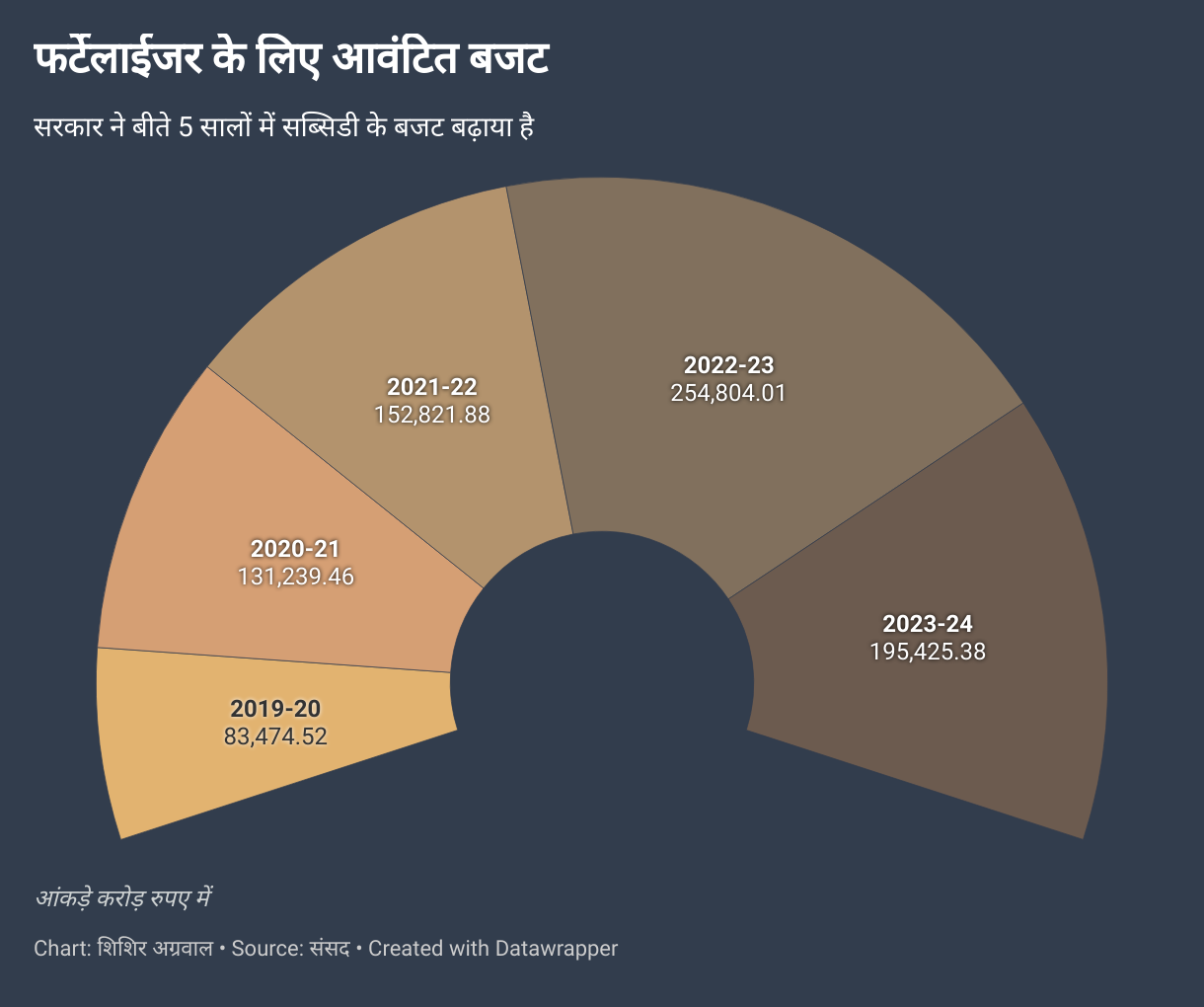 किसानों को कम दरों पर उर्वरक उपलब्ध करवाने के लिए 2010 में न्यूट्रीयंट बेस्ड सब्सिडी (NBS) स्कीम अपनाई गई थी। 2023-24 के अलावा बीते पाँच सालों में उर्वरकों के लिए दी जाने वाली सब्सिडी का बजट बढ़ा है। 2019-20 में यह कुल बजट का 0.89% था। 2022-23 में यह बढ़कर 2.17% हो गया।