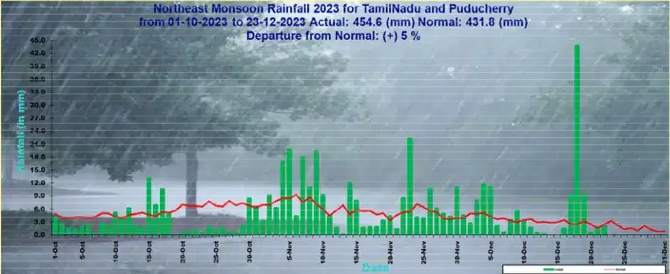 Between October and December, Tamil Nadu received 453.7 mm of rainfall, slightly surpassing the expected normal of 430.7 mm.