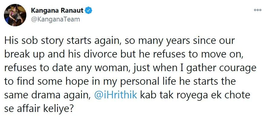 Bollywood actress Kangana Ranaut has tweeted to actor Hrithik Roshan that he starts the same drama again when I have the courage to get some hope in my personal life. How long will you cry for a small affair?.