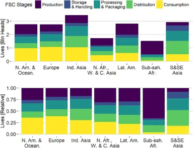 For example, consumption-based losses dominate in North America, Oceania, Europe, and industrialized Asia, while production-based losses are greatest in Latin America, North Africa, West and Central Asia, and especially Sub-Saharan Africa. In South and Southwest Asia, most losses occur in the distribution, slaughter, and processing stages of meat.