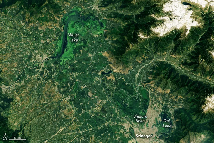 Cassidy explains that bright green flora stands out in the image on the eastern side of Wular. An influx of sediment and nutrients into the lake over the past few decades has contributed to the rapid growth of algae and aquatic vegetation.