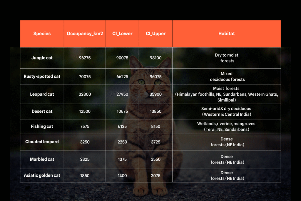 The study covers nine small wild cat species living in tiger-bearing forests, which include Caracal, Rusty-spotted cat, Jungle cat, Asiatic Golden cat, Asiatic Wildcat, Leopard cat, Marbled cat, Pallas’s cat, and Fishing cat. It draws on camera trap data collected during the 2018 and 2022 All-India Tiger Estimation surveys. Scientists examined over 57,000 trap locations across 18 states. This led to more than 24,800 photographs and over 17,000 individual sightings of small cats.