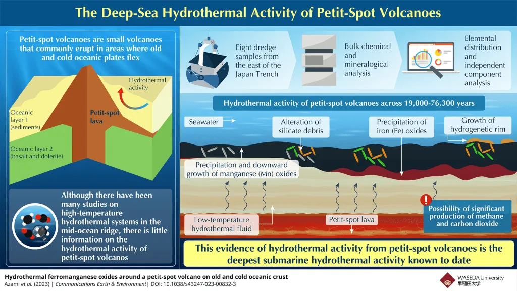 These findings not only establish the presence of petit-spot hydrothermal activity as the driving force behind the formation of these oxides, but also confirm that the petit-spot volcano is the deepest known site of hydrothermal activity. The chemical and mineral compositions of the samples provided evidence of low-temperature hydrothermal activity.