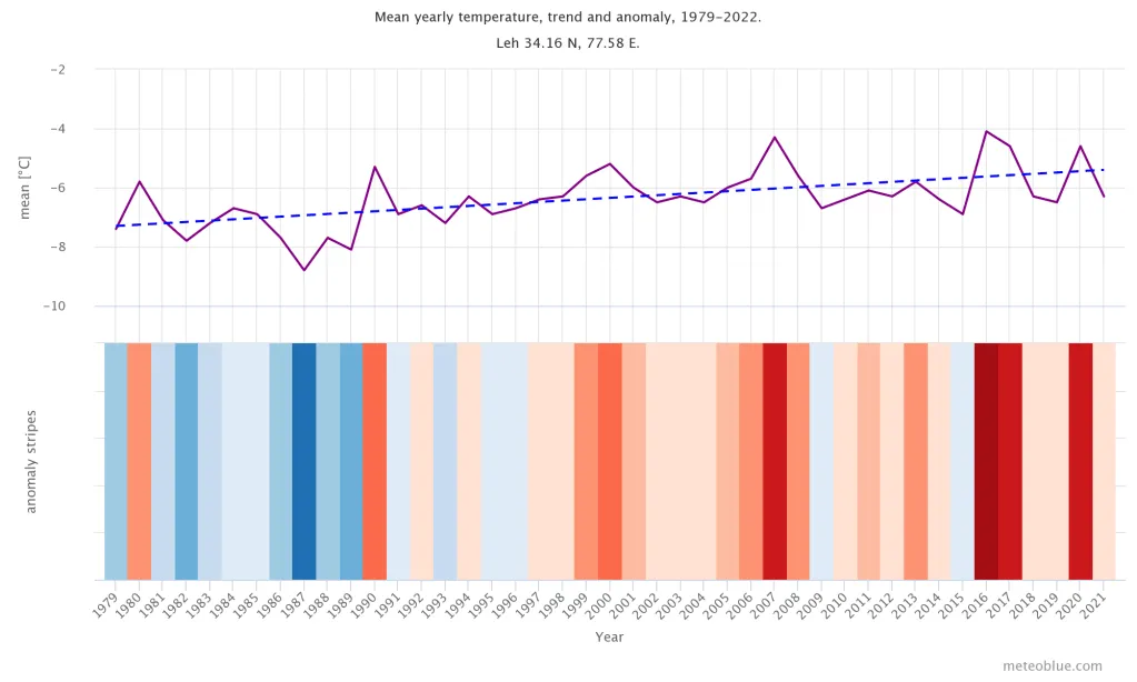 Climate change is not globally uniform and affects some regions more than others. In the diagrams below, you can see how climate change has already affected the Leh region over the last 40 years. The data source used is ERA5, the fifth-generation ECMWF Global Climate Atmospheric Reanalysis, covering the time range 1979 to 2021, with a spatial resolution of 30 km.