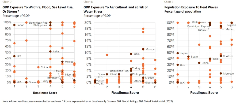 Sovereign | Readiness assessment | Total GDP exposure (wildfire, flood, sea level rise or storms) | GDP exposure-based on agricultural land at risk of waGDP exposure-based on agricultural land at risk of water stress | Agricultural land exposed to water stress | Population exposure (heat waves) |