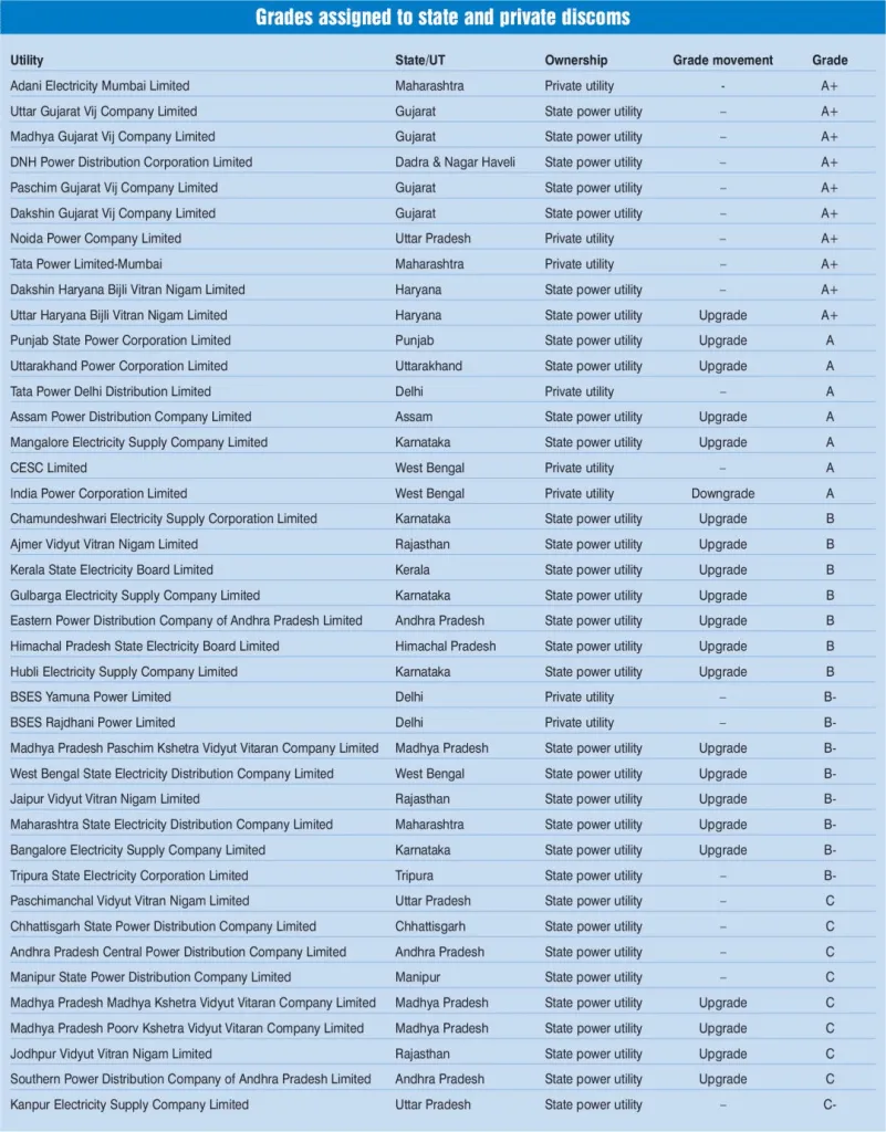 In terms of grades, 24 discoms improved, while only one was downgraded. The number of discoms awarded a grade of C or lower decreased from 35 to 21. Eleven discoms achieved an A+ rating, including private utilities under Adani Electricity Mumbai Limited, Noida Power Company Limited, Tata Power Limited – Mumbai, and TP Western Odisha Distribution Limited; four state-owned discoms from Gujarat and two from Haryana; and DNH Power Distribution Corporation Limited.