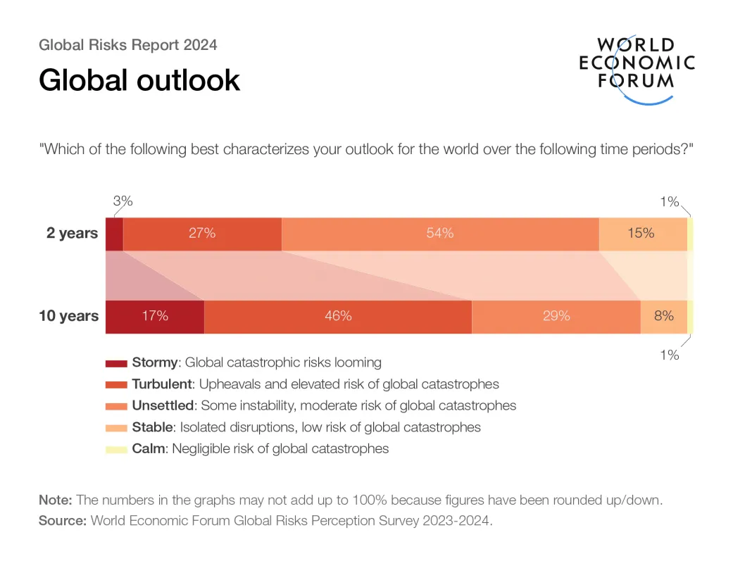 The report, created with Zurich Insurance Group and Marsh McLennan, reflects the views of over 1,400 global risk experts, policymakers, and industry leaders surveyed in September 2023. The results show a mainly negative outlook for the world in the short term, which is expected to worsen over the long term. While 30% of global experts foresee a higher likelihood of global catastrophes in the next two years, nearly two-thirds expect this in the next 10 years.