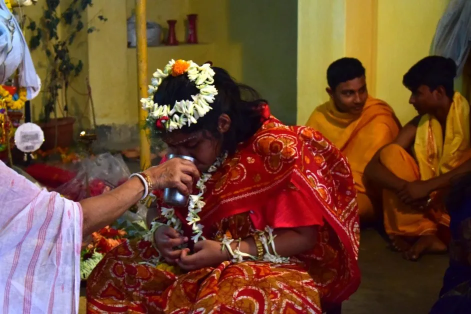 The puja was started in a pot or Kalash worship process in 1918. After that, it was done by idol worship process from 1919 till 1939. From 1939 to 1941 during the 2nd world war, the family had to shift from their house in Banamali Naskar Road, Behala to Ashu Biswas Road near Paddapukur, Bhawanipur, Kolkata, and there the puja was done by worshipping the photographs of the Goddess Durga. (Durga Puja in Traditional Bonedi)