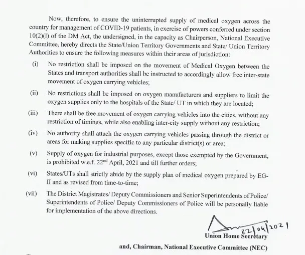 The Union Home Ministry has issued an order to ensure easy supply of oxygen from one state to another.