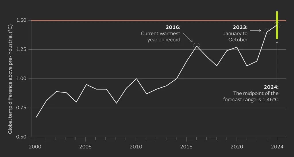 The U.K. Met Office predicts that 2024 could be even hotter, possibly 1.46 degrees C above pre-industrial levels, and maybe even up to 1.58 degrees C. The goal of the Paris Agreement is to keep global warming below 1.5 degrees C.