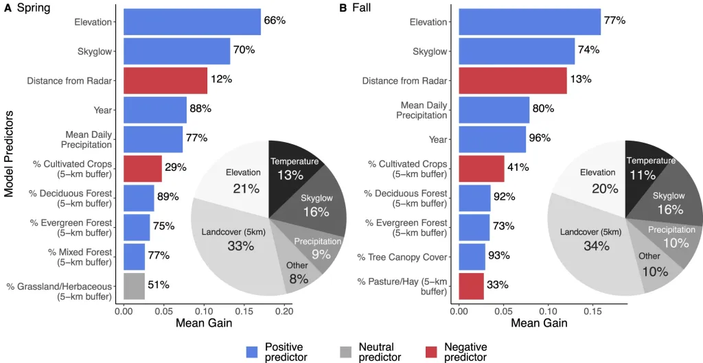 The research analyzed over 10 million radar observations alongside various local factors to understand the birds’ choice of resting spots. Out of 49 predictors, light pollution emerged as the second most significant factor drawing birds to these areas.