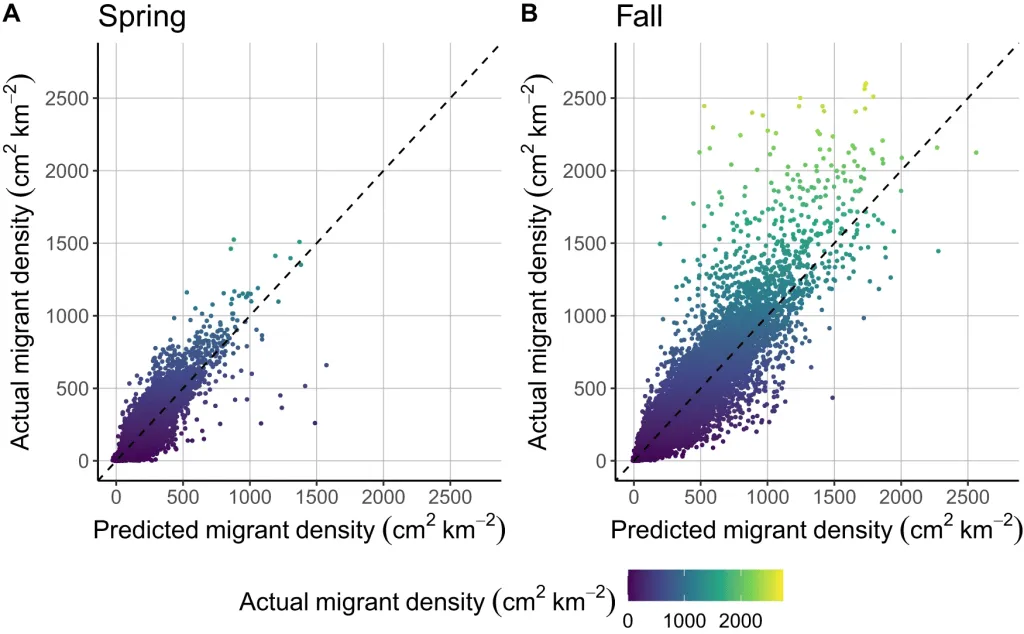 Randomly selected points in 10-km bounding boxes within 400-km boxes. Linear regression for spring and fall migration, indicating high fit.