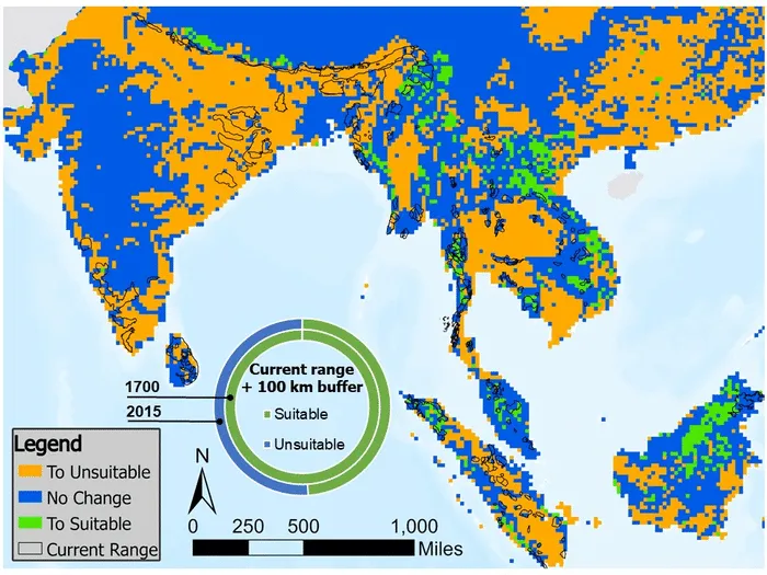 The research team, led by a faculty member from the University of California, San Diego, used a unique data set that models land use change over 13 centuries to estimate that more than 64% of the land has been lost. Historical suitable habitat for elephants in Asia.