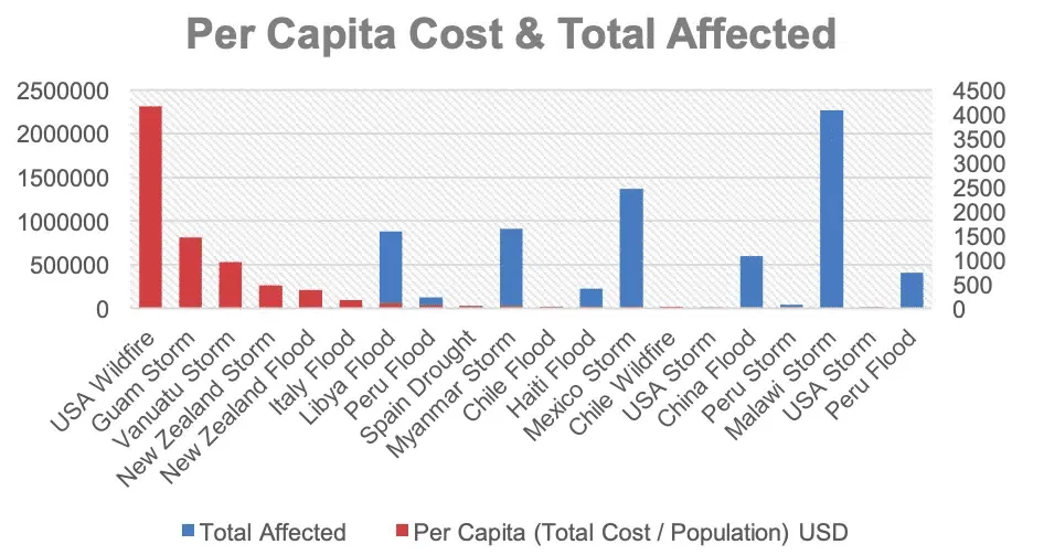 On the other hand, the floods in Peru in April only cost $9 per person. Other notable disasters include the storm in Guam in May, which affected over 60% of the population and cost about $1,455 per person, and the floods in Libya in September caused by Storm Daniel. These floods killed more than 11,000 people and forced more than 1 million people, or over 10% of the country’s population, to leave their homes.