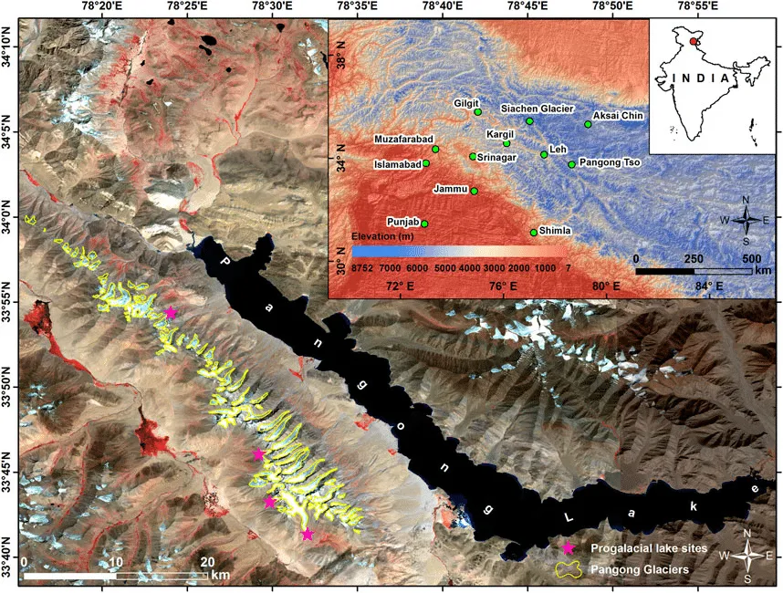 - The study reveals that Pangong’s glaciers have retreated primarily due to atmospheric warming and increased human activity near glacier and periglacial environments.