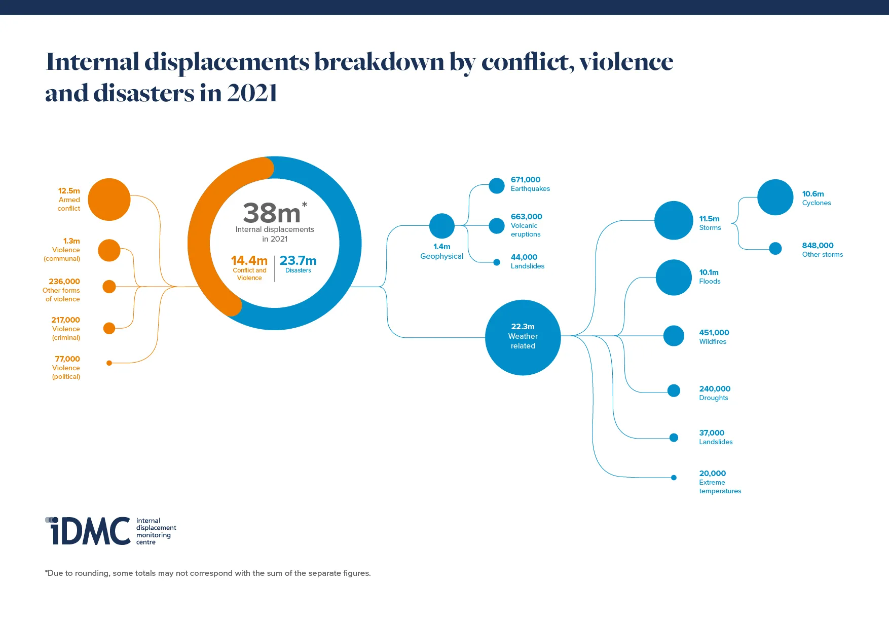 People displaced by conflict remain the largest, but natural disasters are the main cause of displacement (23.7 million displacements due to these phenomena in 2021).