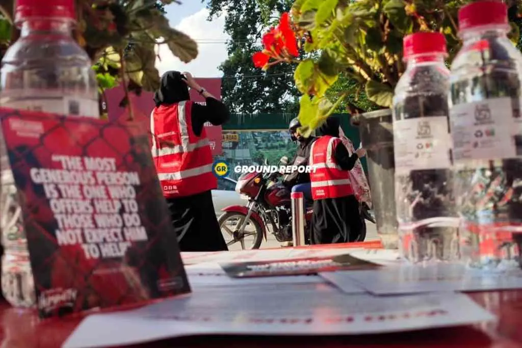 “Who is Hussain” ensuring responsible disposal of plastic bottles at our water distribution stall. Photo Credit: Jahangir Sofi/Ground Report