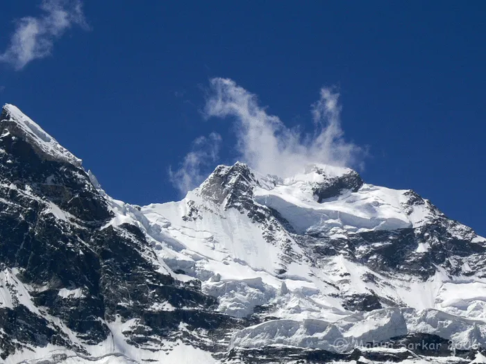 The Parkachik Glacier, situated in Kargil, Ladakh, India, majestically descends from the Nun-Kun slopes. Ice chunks break off its towering front wall, forming a stunning ice-fall into the Suru River. Visitors can cross a suspension footbridge for a closer view.