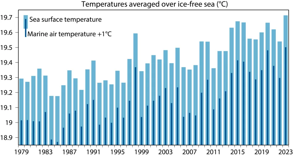 The extent of Antarctic sea ice reached a record low for the third time in 2023, registering a monthly value 17% below the average for this time of year. The Weddell, Bellingshausen and Northern Ross Seas witnessed the most significant decrease in sea ice concentrations, while the Amundsen Sea continued to exhibit above-average concentrations.