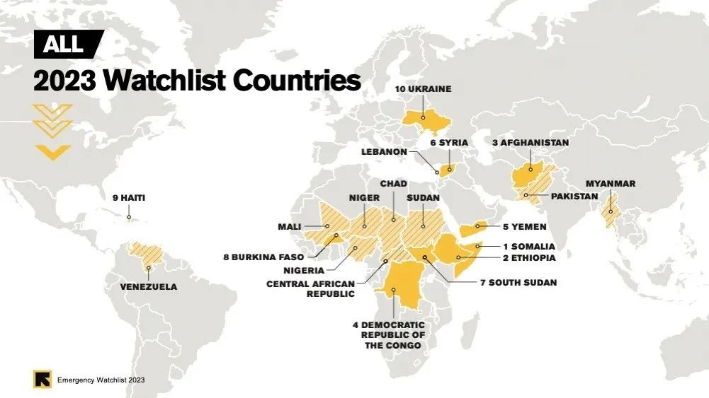 In its “Emergency Watchlist 2023” report, the IRC ranks the 20 countries most at risk of a deterioration in their humanitarian situation over the coming year.