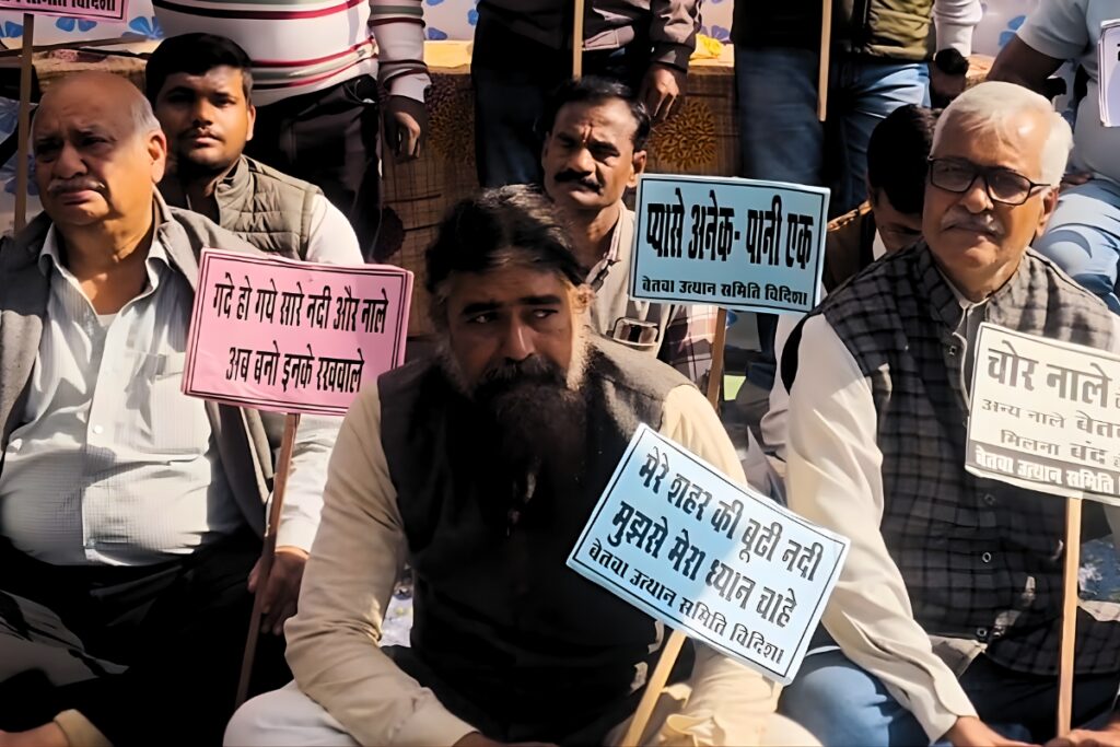 विदिशा के माधवगंज चौराहे पर कुछ लोग हाथों में तख्तियां लेकर प्रदर्शन कर रहे हैं। इनमें ‘नदियों की रक्षा है देश की सुरक्षा’ और ‘सबकी ज़रूरत सबकी बेतवा’ जैसे नारे लिखे हुए हैं। यह प्रदर्शन बेतवा नदी को प्रदूषण मुक्त बनाने के लिए किया जा रहा था। प्रदर्शनकारियों ने इंदौर में दूषित पानी से हुई मौतों का हवाला देते हुए बेतवा को प्राथमिकता के साथ साफ करने की मांग की। उनके अनुसार शहर के 5 नाले इस नदी से मिल रहे हैं, जिससे स्थानीय लोगों के स्वास्थ्य पर असर पड़ सकता है।
