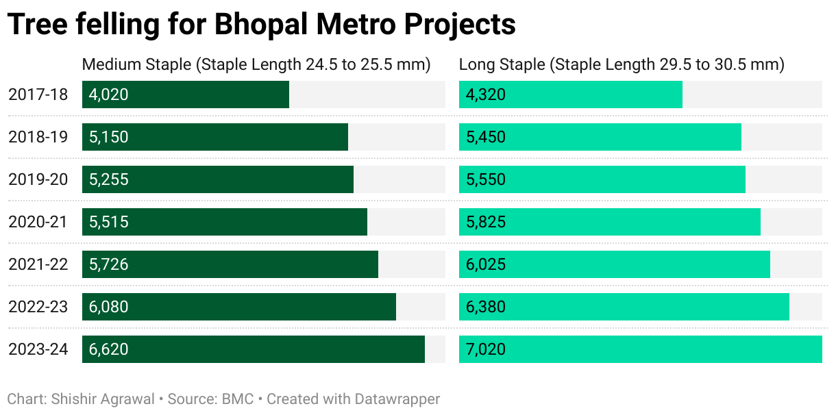 मेट्रो रेल परियोजना (Bhopal Metro) के लिए अब तक कुल 3 हज़ार 101 पेड़ काटे गए हैं. मेट्रो प्रोजेक्ट के अंतर्गत 7 सब-प्रोजेक्ट जिनमें मेट्रो के लिए रेल लाइन, मेट्रो स्टेशन, डीपो निर्माण और इलेक्ट्रिक सब-स्टेशन का निर्माण शामिल है, के लिए कुल 1877 पेड़ों के कटने का अनुमान था. मगर असल में इसके लिए 3 हज़ार 101 पेड़ काटे गए.