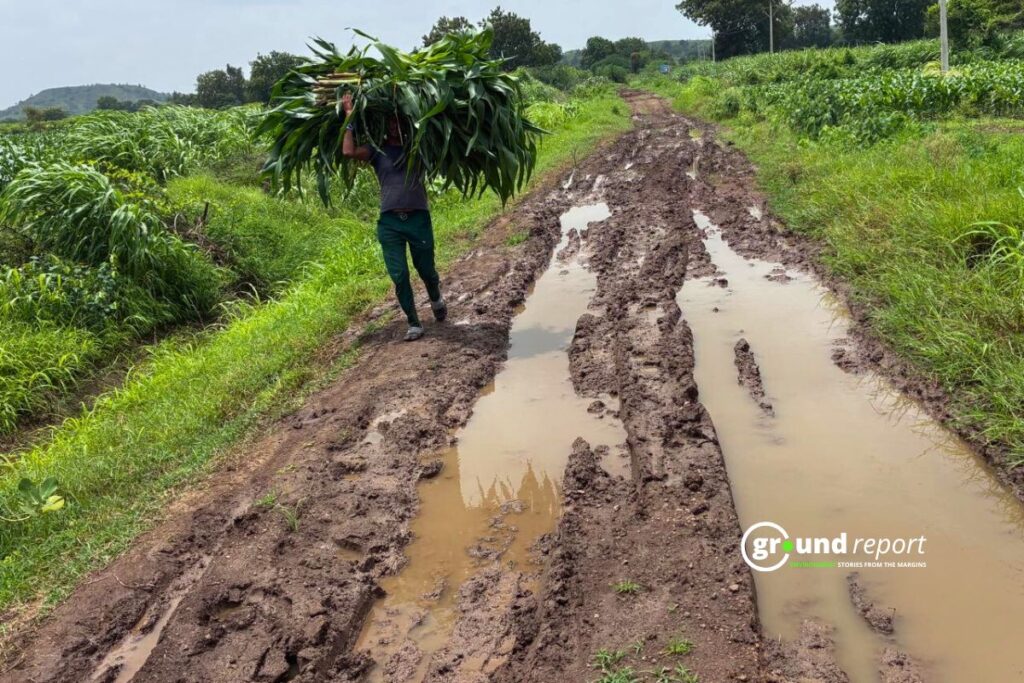 Taking us to his second field, located between village Kuan and Kerwa, he showed that the road that was supposed to be built alongside the canal has not been constructed. Due to this, during the rains, the mud makes it extremely difficult for both livestock and humans to walk. Since vehicles cannot reach the fields, farmers are forced to carry cattle fodder on their heads.