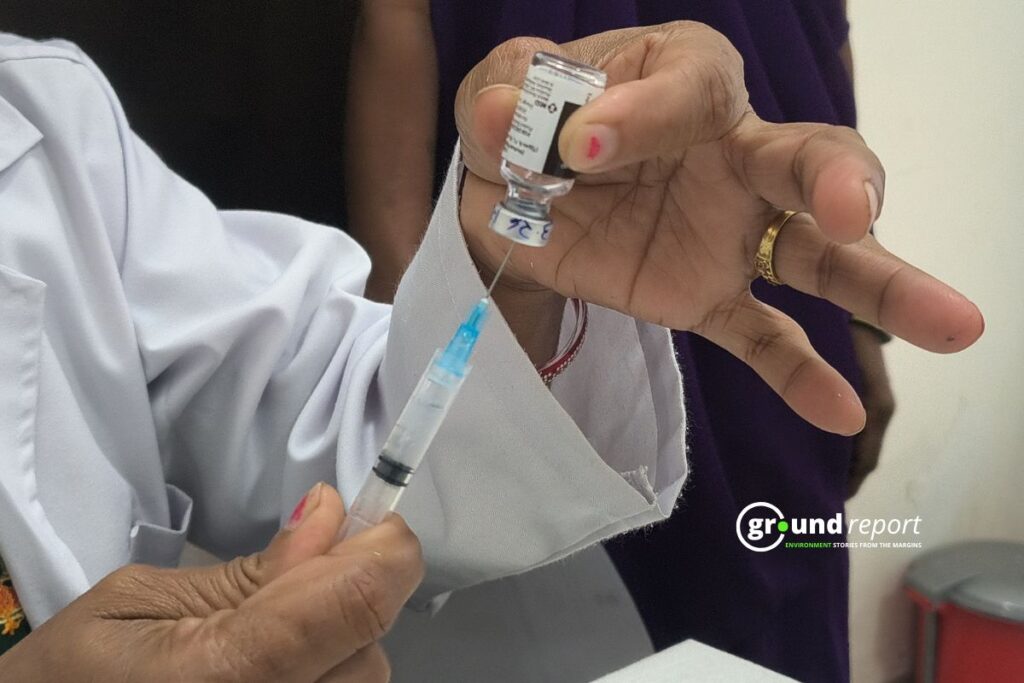 ANM Rekha Dwivedi administers the HPV vaccine to a girl at Rajgarh District Hospital. Photo: Abdul Waseem Ansari. Photo: Abdul Wasim Ansari