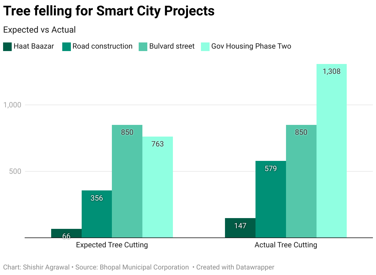 For instance, for the construction of Haat Bazaar under the Smart City Development Corporation, an estimated 66 trees were expected to be cut for a cost of Rs. 34,34,16,984 in the TT Nagar area. However, the actual number of trees cut for this sub-project was 147. Similarly, the construction of government quarters in the TT Nagar area led to the felling of 1,308 trees, the highest in any sub-project.