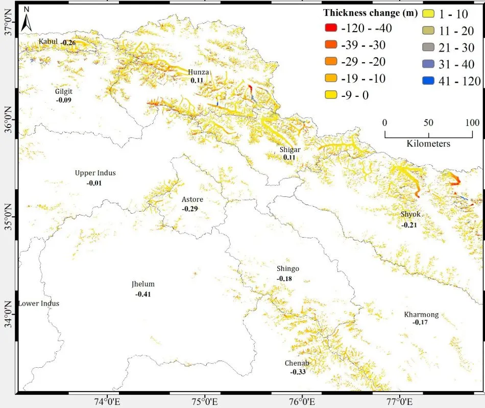 Examining the entire Indus basin, it was noted that glaciers in the northwest were experiencing significant mass loss. Similarly, glaciers in the southern Himalayan regions such as Chenab, Jhelum, and Ravi were melting rapidly, albeit not contributing substantially to river flows due to their smaller coverage area. The combined mass loss from these glaciers had a minor impact on rising sea levels.