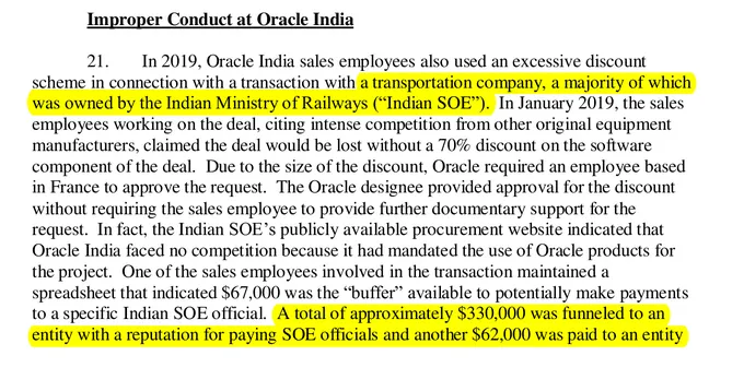 According to the SEC, Oracle India sales employees also used an excessive discount scheme in connection with a transaction with the Indian SOE in 2019. The offer would be lost without a 70% discount on the software component of the offer. Due to the size of the discount, Oracle required an employee based in France to approve the request.