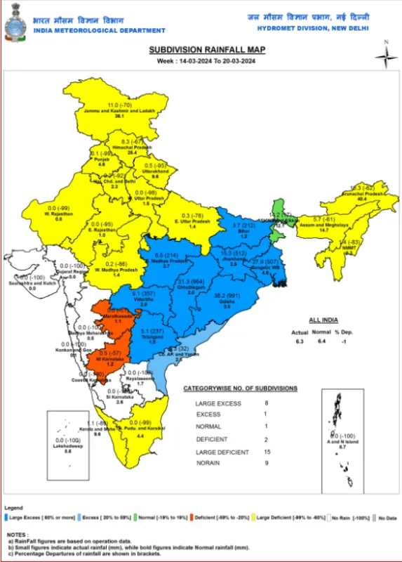 The week ending March 20th, 2024, saw significant rainfall across Eastcentral and Northeast India. Regions such as East Madhya Pradesh, Jharkhand, and others experienced light to moderate rainfall with isolated thunderstorms and gusty winds. Notably, some areas reported heavy rainfall and hailstorms, which led to a marked decrease in daily maximum temperatures recorded at 6-11°C below the norm.