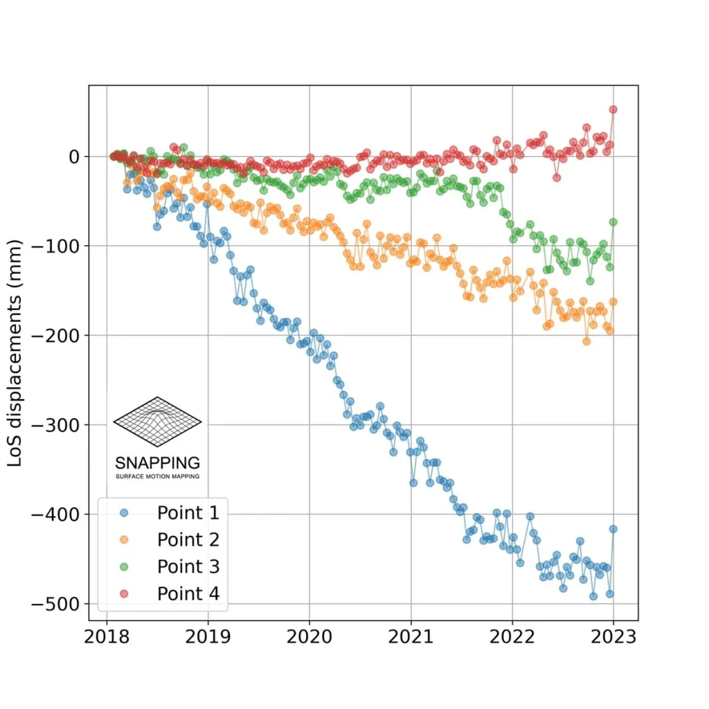 SNAPPING provides the average velocities as well as the full displacement time series (ie, the evolution of motion over time) for each PSI (Persistent Scattering Interferometry).