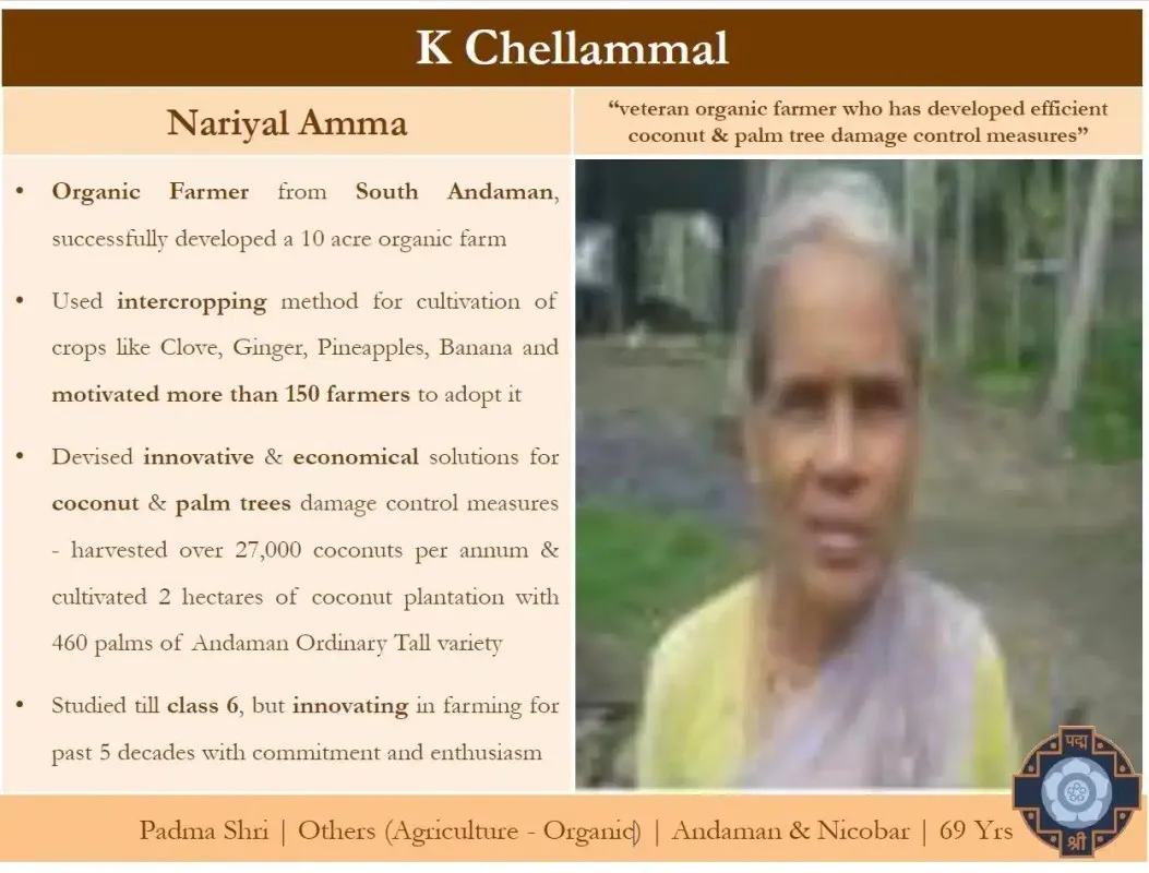 K Chellammal a 69-year-old woman is a veteran organic farmer from Andaman and Nicobar. She is known as Nariyal Amma and has developed methods to protect coconut and palm trees from damage. Chellammal also has a 10-acre organic farm where she grows cloves, ginger, pineapples, and bananas.
