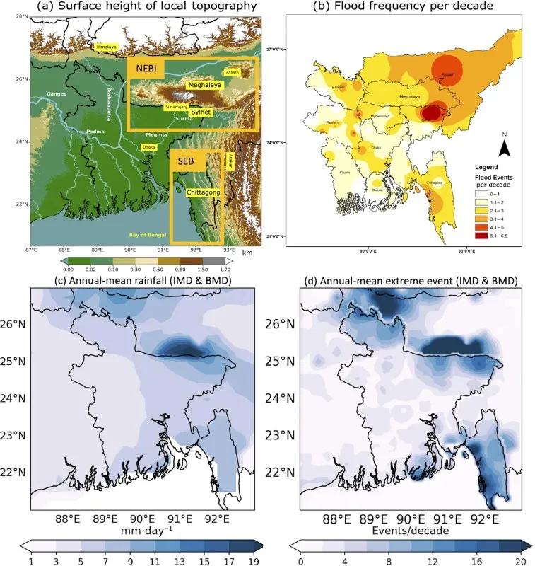 “Bangladesh and Northeast India face increasing flood risks due to extreme monsoon rains, exacerbated by dense populations. The rising rainfall intensity challenges weather forecasting models amid climate changes. Future projections indicate further escalation, necessitating long-term flood-proofing strategies. Targeting hotspots and ensuring flood resilience across vulnerable districts is crucial,” emphasized Koll.