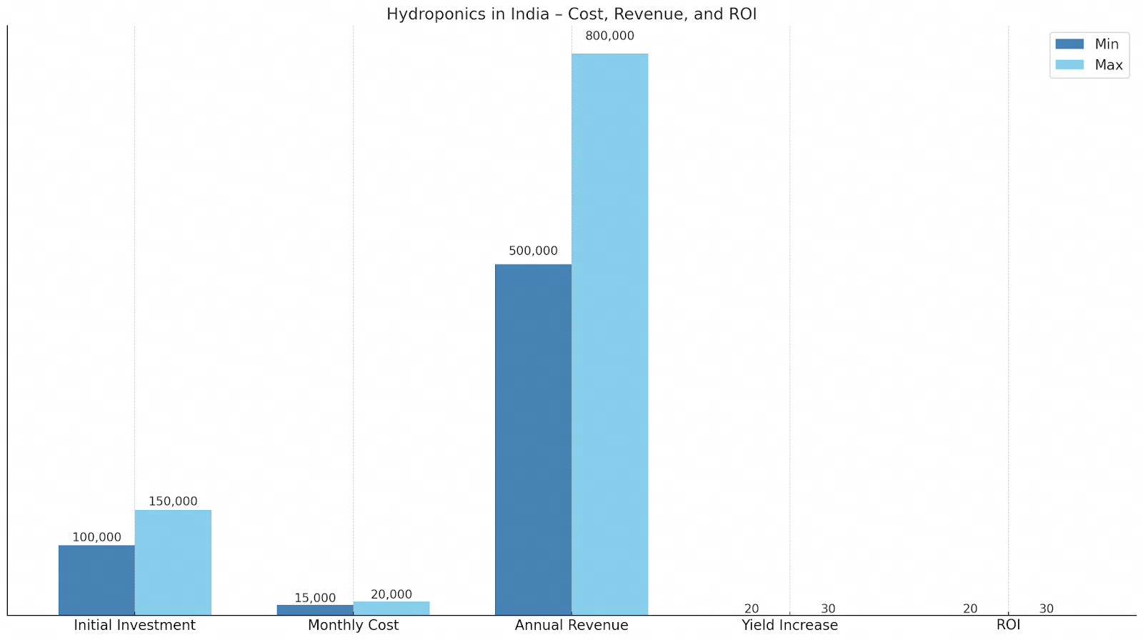 Initial investment: Setting up a small hydroponic unit (under 1,000 sq ft) typically costs ₹1–1.5 lakh, including racks, nutrient systems, lighting (if indoors), and water pumps.