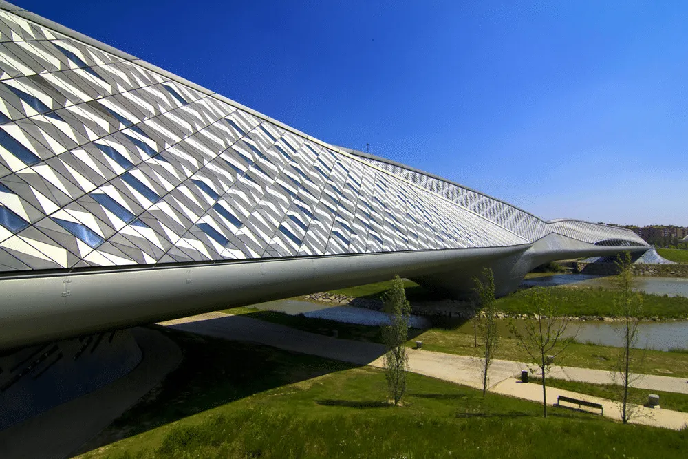 Built for the 2008 Zaragoza World Expo, Zaha Hadid’s first completed bridge was inspired by the river and the gladioli blossoms below it. It is made up of more than 900 feet of fibreglass and concrete and served as a walkway over the Ebro River and an exhibition during the Expo. Upon its completion, Zaha Hadid commented that “The Bridge Pavilion (was) a seminal project for the practice.”