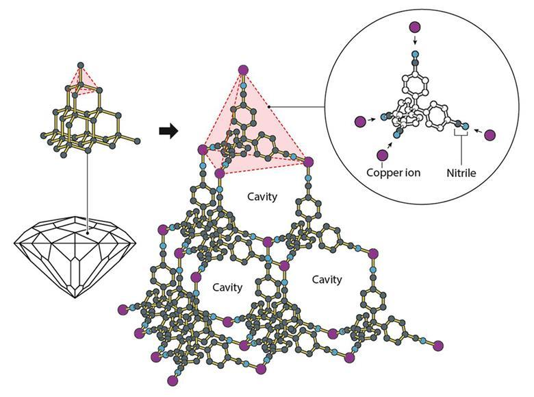 Richard Robson used copper ions and organic linkers to mimic diamond’s structure, creating crystals with wide internal spaces. Source: © Jonah Jarneastad/The Royal Swedish Academy of Sciences