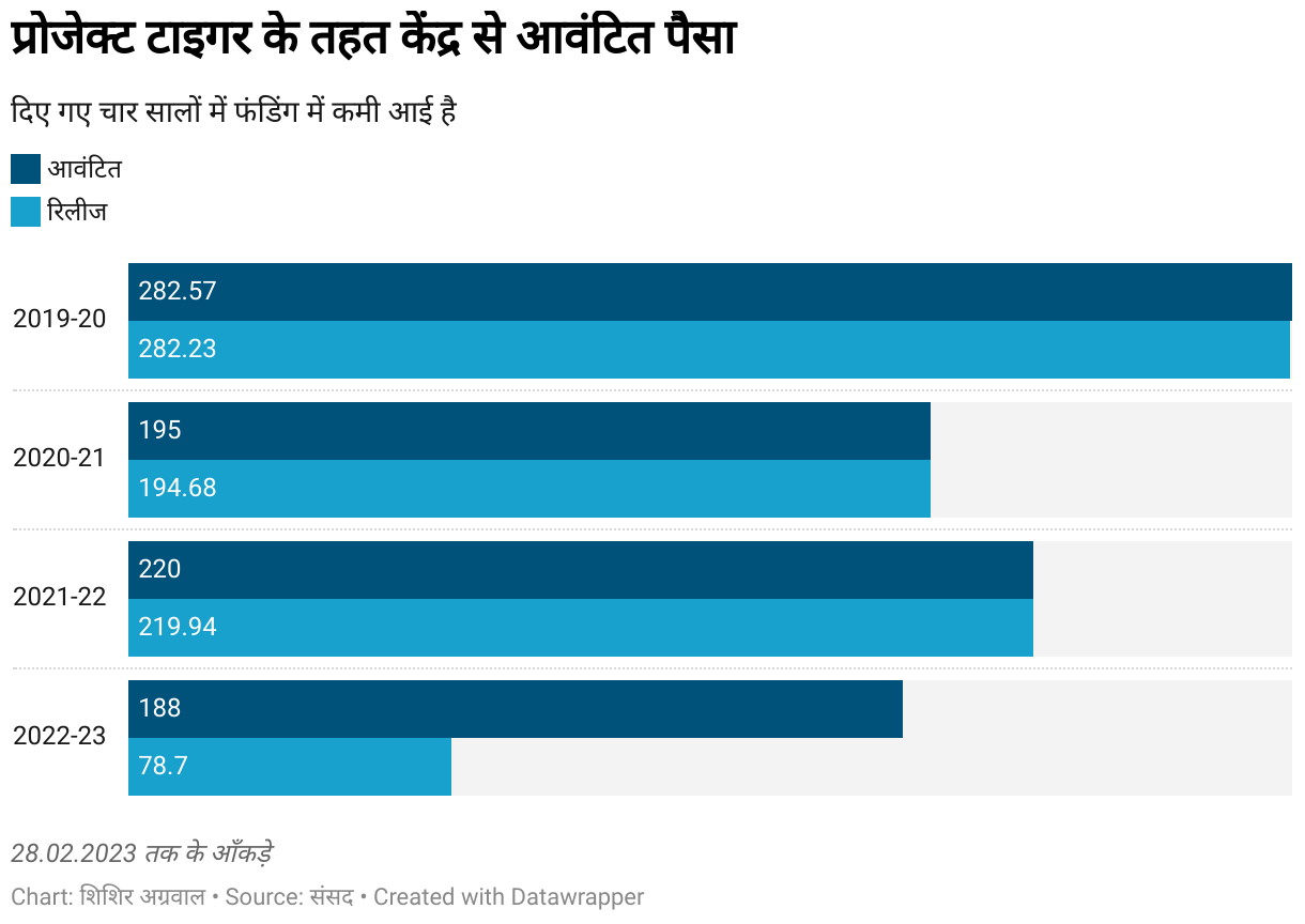 मगर संसद में दिए आँकड़ों के अनुसार 2019 से 2022-23 तक प्रोजेक्ट टाइगर कि फंडिंग में कमी आई है। 2019 में इसके लिए 282.57 लाख रूपए आवंटित किए गए जबकि 282।23 लाख रुपए रिलीज किए गए। मगर 28 फरवरी 2023 तक के आँकड़ों के अनुसार 188 लाख रूपए ही आवंटित किए गए थे जिसमें से केवल 78.70 लाख ही रिलीज किए गए।