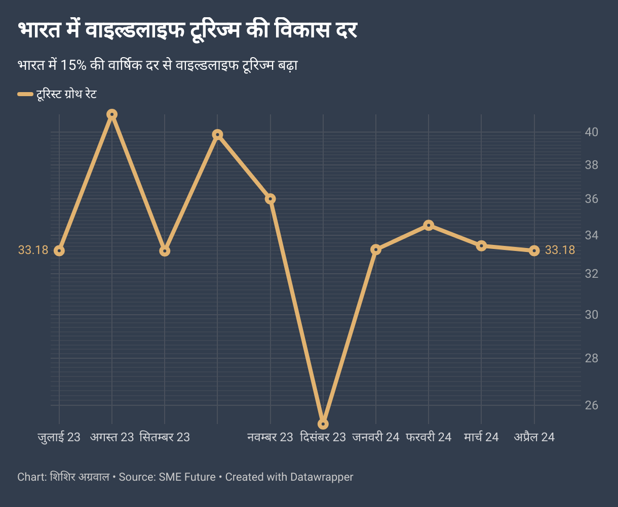 2020 तक के आँकड़ों के अनुसार भारत में हर साल 15% की वार्षिक दर से वाइल्डलाइफ टूरिज्म बढ़ा है। इसी साल के अप्रैल में इससे होने वाले मुनाफे में 1.2% का इजाफा हुआ है। जबकि मई, 2024 में यह दर 1.7 हो गई। इसका सीधा अर्थ यह है कि भारत में वाइल्ड लाइफ टूरिज्म तेजी से बढ़ रहा है।