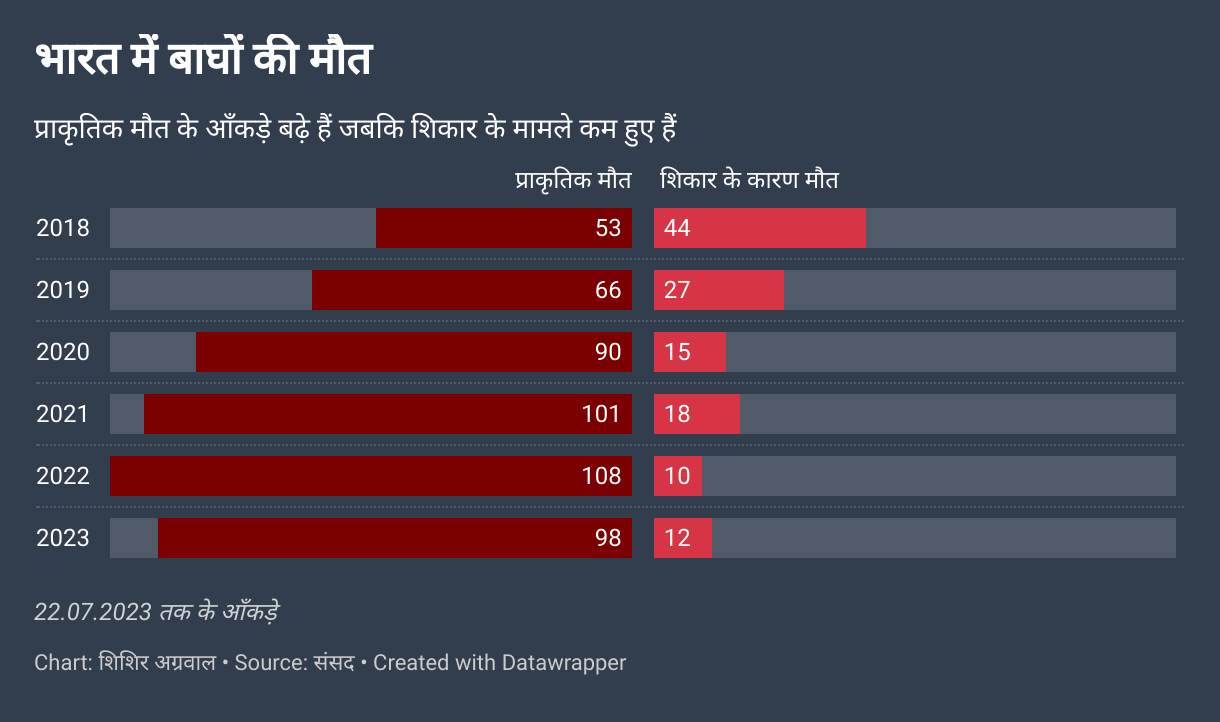 जुलाई 2023 को संसद में दिए एक जवाब में सरकार ने बताया कि 2018 से 2023 के बीच भारत में बाघों की मौत के आँकड़ें में इजाफा हुआ है। सरकार ने जो आँकड़ें पेश किए उसके अनुसार इस दौरान देश में बाघों की शिकार के चलते मौत में कमी आई है। मगर इसी बीच इनकी प्राकृतिक कारणों से मौत में बढ़ोत्तरी भी हुई है।