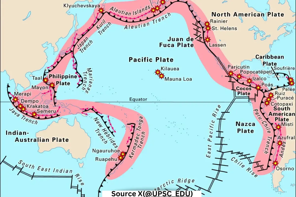 ये क्षेत्र सरकम-पैसिफिक रिंग ऑफ फायर के अंतर्गत आता है। इस क्षेत्र में प्रशांत महासागर की प्लेट अपने दोनों और से अमरीकी और एशिया-ऑस्ट्रेलिया प्लेट से टकराती है। इस कारण इस क्षेत्र में अत्यधिक भूकंप, सुनामी, और ज्वालामुखी घटनाएं होती हैं।