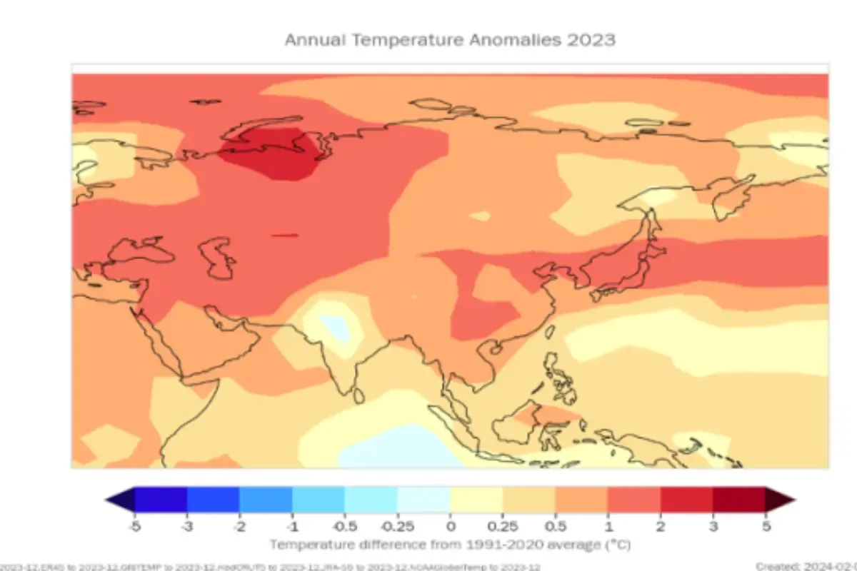2023 में, औसत वार्षिक सरफेस टेंप्रेचर 1961-1990 के औसत से 1.87 डिग्री सेल्सियस अधिक और 1991-2020 के औसत से 0.91 डिग्री सेल्सियस अधिक था। अगर बात सीधे-सीधे कही जाए तो दुनिया पूर्व-औद्योगिक औसत (1850-1900) की तुलना में कम से कम 1.1 डिग्री सेल्सियस अधिक गर्म हो गई है। हालंकि इस रिपोर्ट में यह माना गया है कि, तापमान में अंतर की गणना करने के लिए, एशिया और दुनिया में अलग-अलग रेफरेंस पीरियड हैं क्योंकि एशिया और दुनिया में 1900 के दशक से पहले का डेटा अपर्याप्त है। अधिक चिंता की बात यह है कि एशिया में तापमान वृद्धि की दर तेज़ हो रही है। हाल के दशकों में यूरोप को छोड़कर अन्य क्षेत्रों की तुलना में एशिया अधिक गर्म हो गया है।